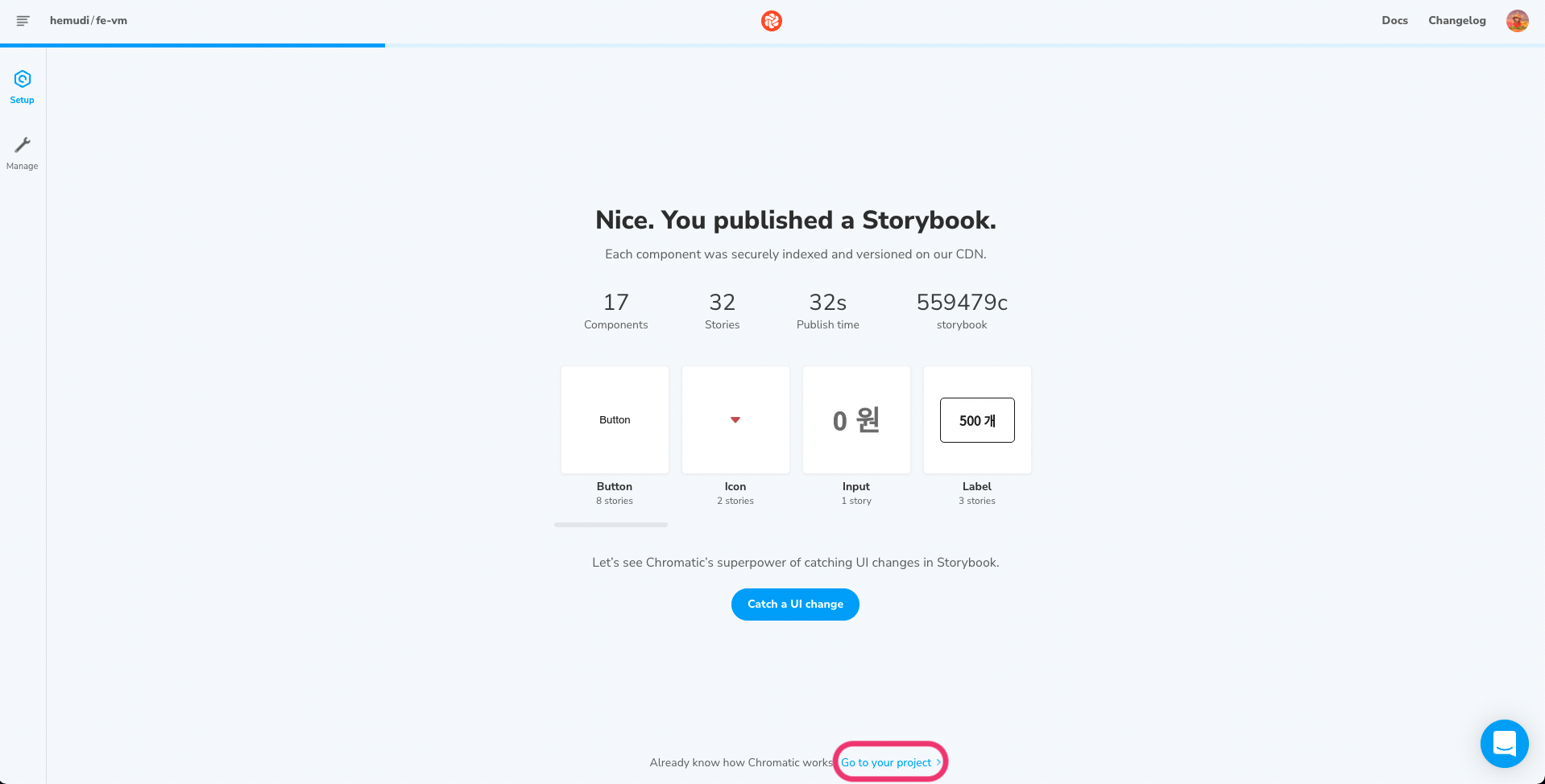 npx chromatic --project-token=<project ๊ณ ์ token>