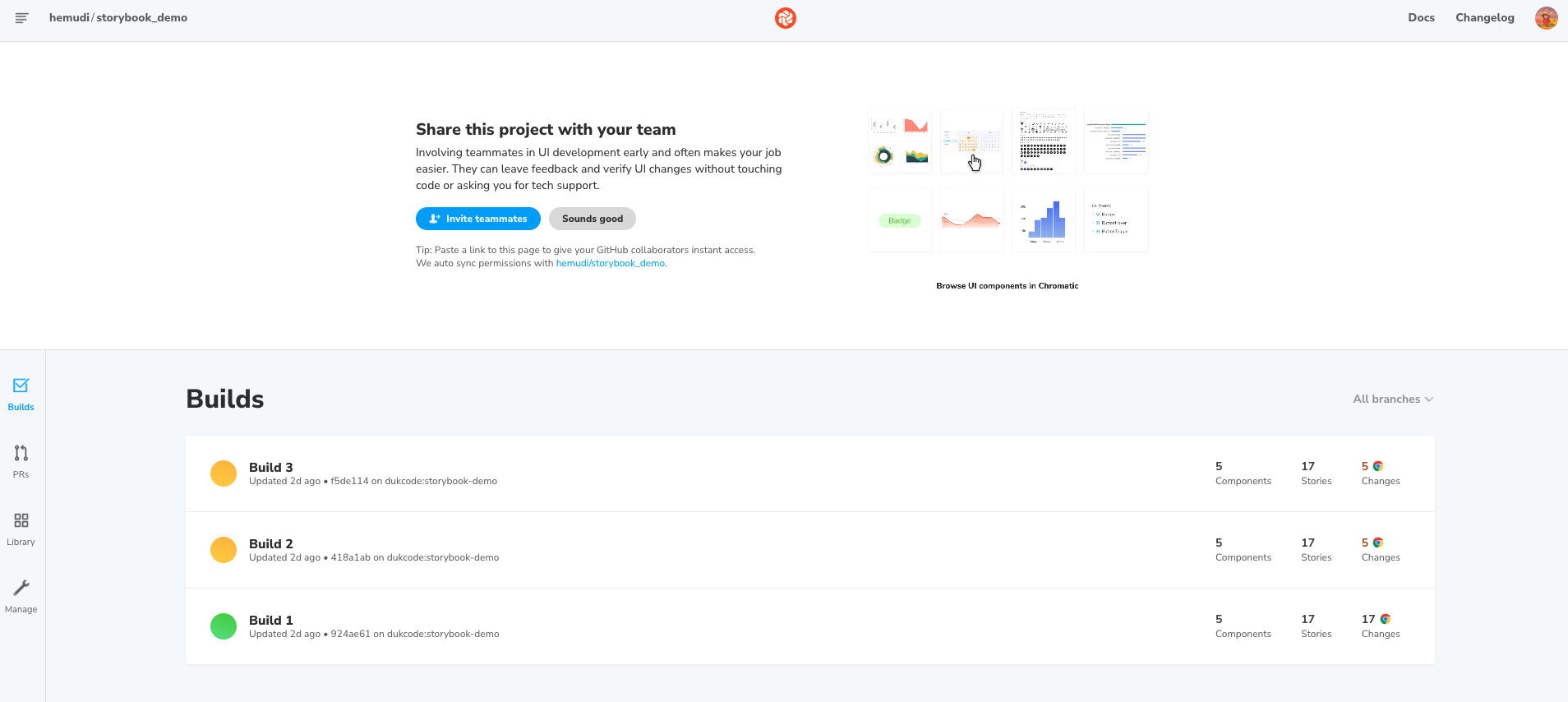 Chromatic ๊ณผ ํจ๊ป๋ผ๋ฉด ๋ฐฐํฌ๋ ๋ฌผ๋ก ๊ทธ ์ดํ์ build ๊ด๋ฆฌ๊น์ง Storybook ๋ง์ถค์ผ๋ก ์์ฝ๊ฒ ํ ์ ์๋ค!